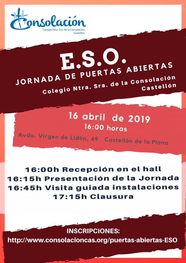 Invitamos a los centros educativos y a todo aquel interesado a inscribirse en la Jornada de Puertas Abiertas de ESO de Consolación Castellón.